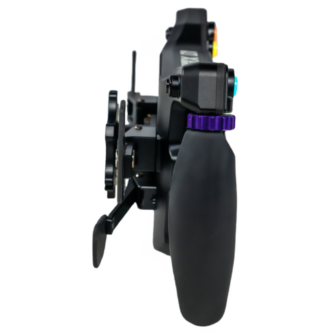 The open design of the purple thumb wheels allows operation with both thumb and index finger, improving control efficiency. Freed from its enclosure, this pair of encoders also visually integrates into the steering wheel's profile, adding a unique aesthetic touch.
